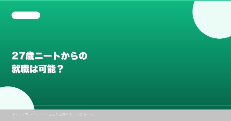 27歳はまだ20代。企業の多くが「20代ならポテンシャルで採用する」と考えています。ニート支援に特化したエージェントでは、就職成功率80%以上の実績も。大切なのは「もう遅い」と諦めないこと。27歳なら、正しいサポートを受ければ最短1〜2ヶ月で正社員になれます。