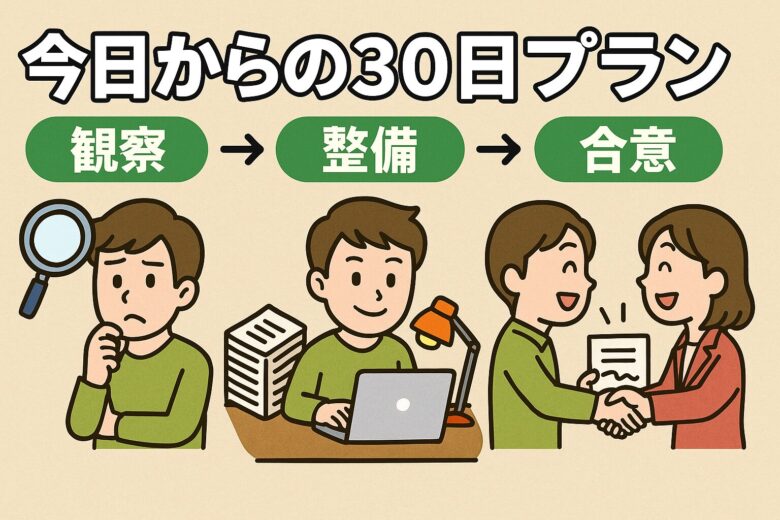 次は、これらを実際に回す30日プランです。観察→整備→合意の順で進めます。→ 今日からの30日プラン