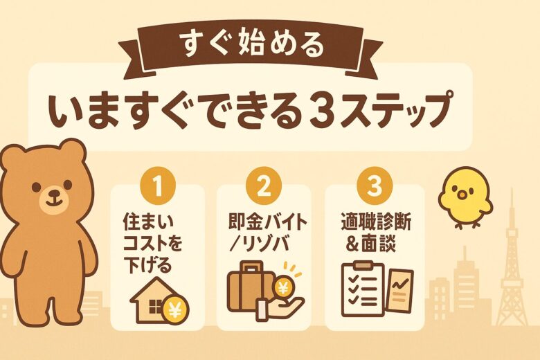上京のボトルネックは固定費です。寮や提携シェアで住居コストを下げ、適職診断で方向を定め、面談日程を先に確保しましょう。行動の順序を正すだけで、必要資金と期間は大きく短縮できます。