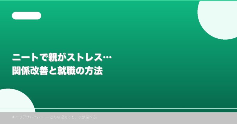ニートで親がストレスという状況は、あなただけでなく親も苦しんでいるということ。内閣府の調査では、ニートの子を持つ親の約78%が「子どもの将来に強い不安を感じている」と回答。大切なのは、いきなり就職ではなく「小さな一歩」を見せること。エージェントに登録するだけでも、親の安心感は大きく変わります。